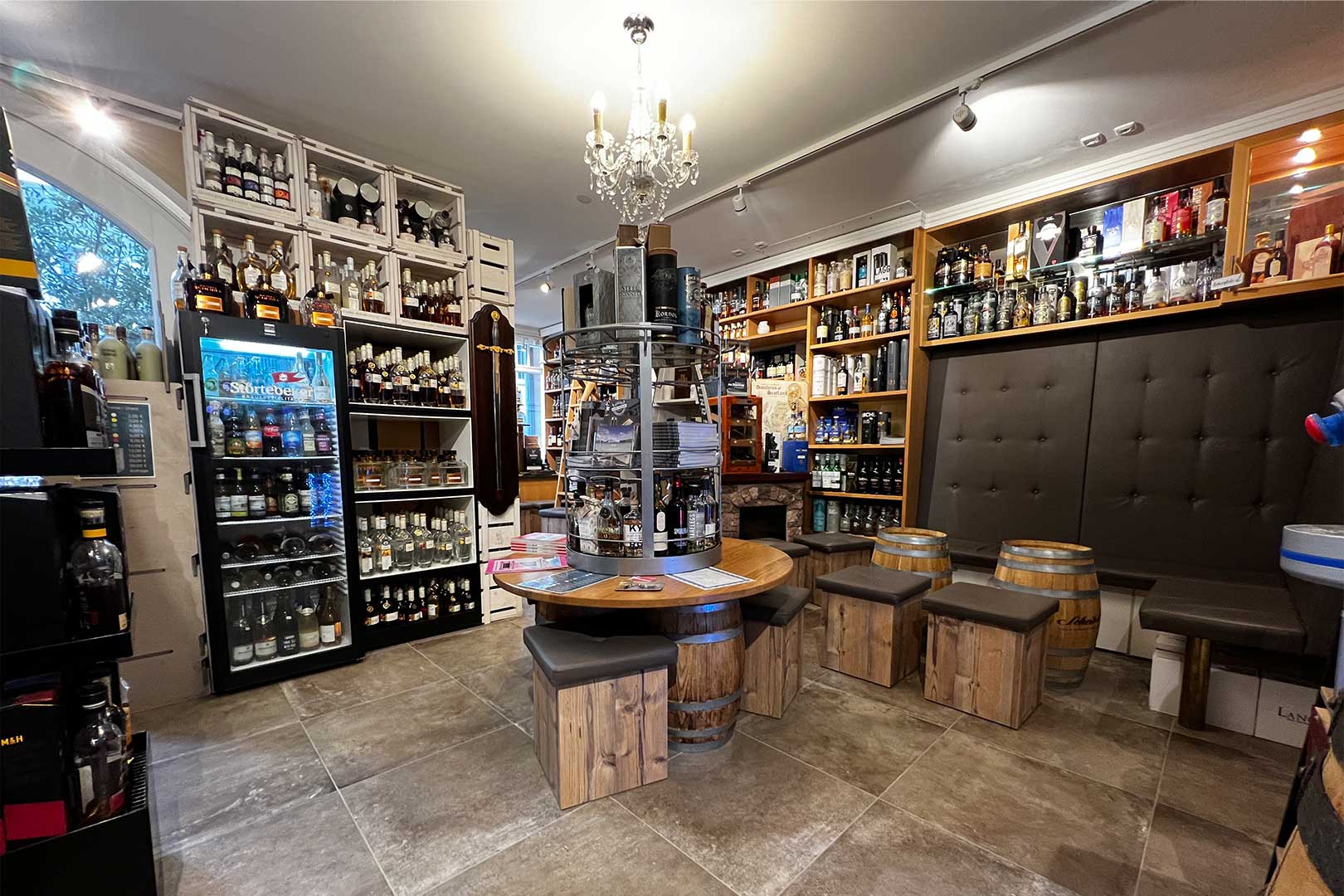 Ca. 850; Schwerpunkte: Single Malts (650), Blended Scotch (40), Irish Whiskey (60), US-Whiskey (40), Japanischer Whisky (25), New World Whisky (40, u.a. AU, FR, FI, IL, IS, IT, SE, TW, ZA), Deutscher Whisky (70), Schweizer Whisky (30), Raritäten (20, u.a. Bruichladdich 1984, 1985, 1988, Bushmills Artist's Reserve 15 (56,5%), Grace O'Malley 19 Amarone Cask, Kilchoman Comraich, Paul John Kanya)